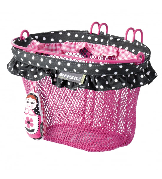 oval, Stahl, engmaschig, abnehmbar, mit Baboushka Pendel, farbigem Zierrand, sichere Lenkerhaken, Tragbügel.